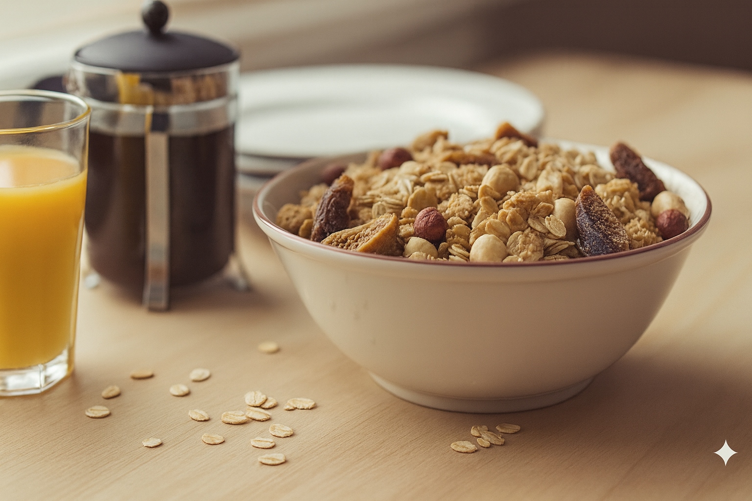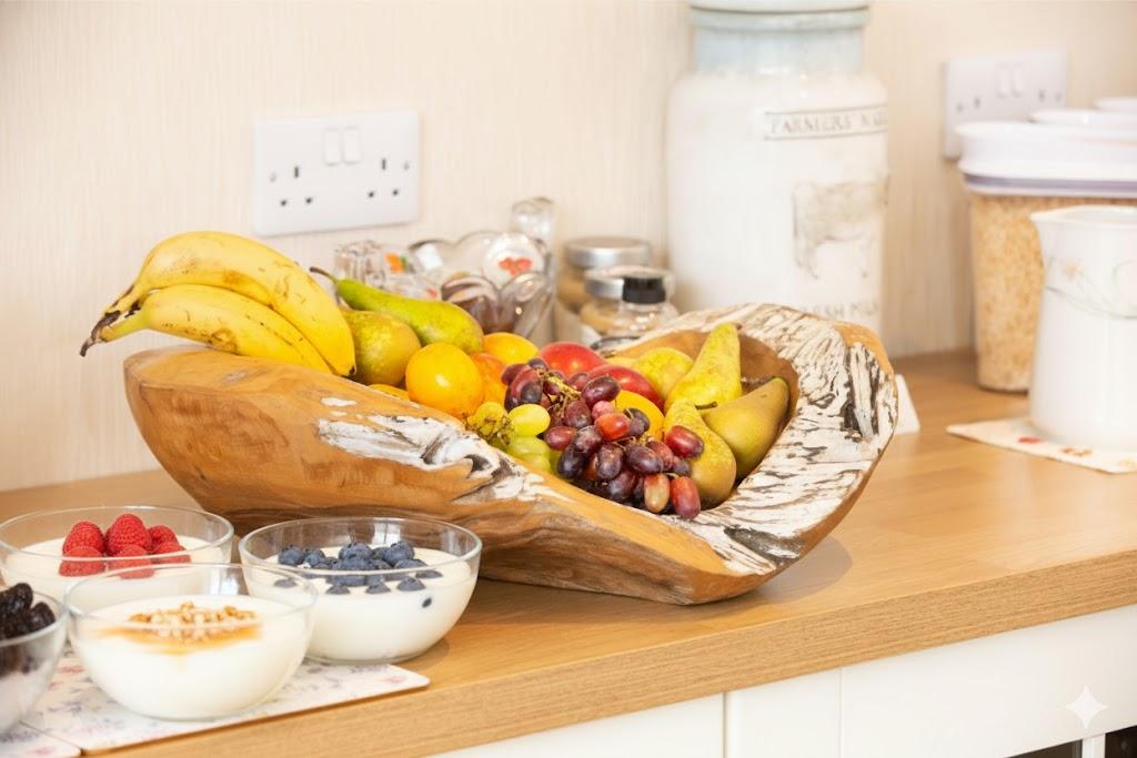 A choice of cereals or muesli, Porridge (cooked to order), Chilled Fruit Juices, Assorted Yoghurts, Fresh Fruit