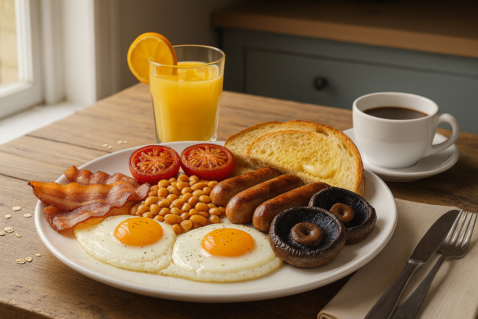 Bacon, Cumberland Sausage, Tomato, Mushrooms, Baked Beans, Hash Brown, Eggs (Scrambled, Poached or Fried)